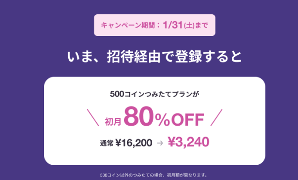 私の招待リンクから登録すると、通常16,200円の「500コインプラン」が、驚愕の割引になります。